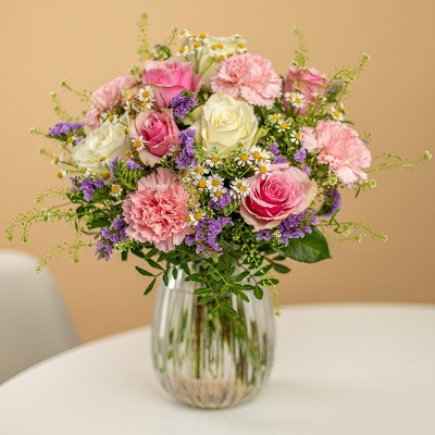 Dit boeket heeft een zacht en dromerig kleurenpalet met pastelkleuren zoals geel, roze en lavendel, waardoor het een delicate en elegante uitstraling heeft. Het bevat bloemen zoals rozen, anjers, limonium en tanacetum. Het beste aan dit boeket? Het is verkrijgbaar voor een betaalbare prijs.